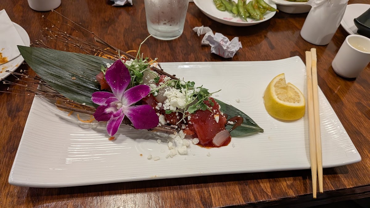 Outstanding meal and excellent service. I can't compliment them enough for an excellent mix of traditional sushi and creative roles. Our server was bright and attentive, food moved at a reasonable page. In particular, the salmon sashimi was top notch. As you'll see from the photo, presentation was elevated.