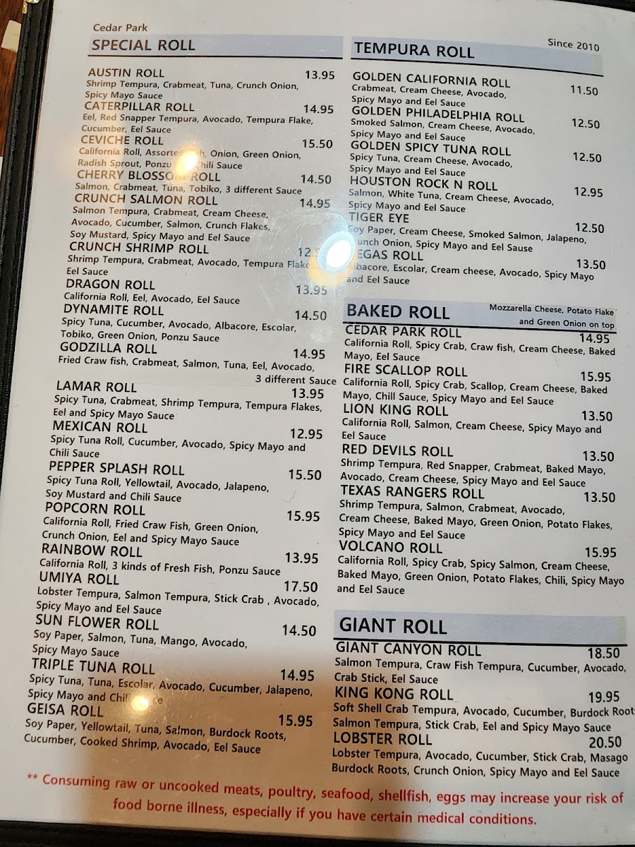 Umiya Cedar Park offers a thoughtfully curated menu that blends traditional Japanese sushi with creative twists, perfect for those seeking a relaxed yet flavorful dining experience. The menu features a variety of rolls, including tempura options like shrimp and salmon tempura rolls, alongside unique baked selections such as the Cedar Park Baked Roll and the bold Texas Ranger’s Baked Roll. For those celebrating a special gathering or simply enjoying a leisurely meal, the giant rolls offer generous portions with complex layers of texture and flavor.
